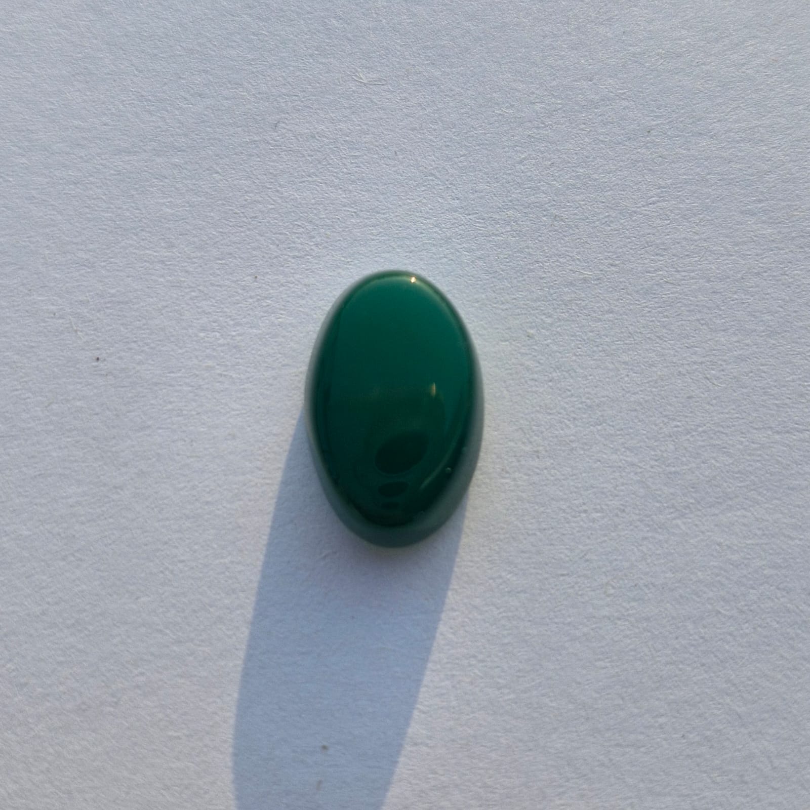 This gemstone is a polished oval cabochon of Green Aqeeq (Green Agate), featuring a rich, deep green shade with a clean glossy surface. Green Aqeeq is popularly worn in rings, pendants and spiritual accessories due to its elegant look and association with calmness, emotional stability and clarity. The stone’s smooth finish and balanced size make it suitable for both men’s and women’s jewelry designs.